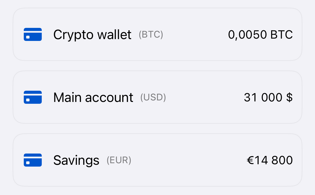 All accounts in one place. Track total balances by currency and crypto with one clear interface.