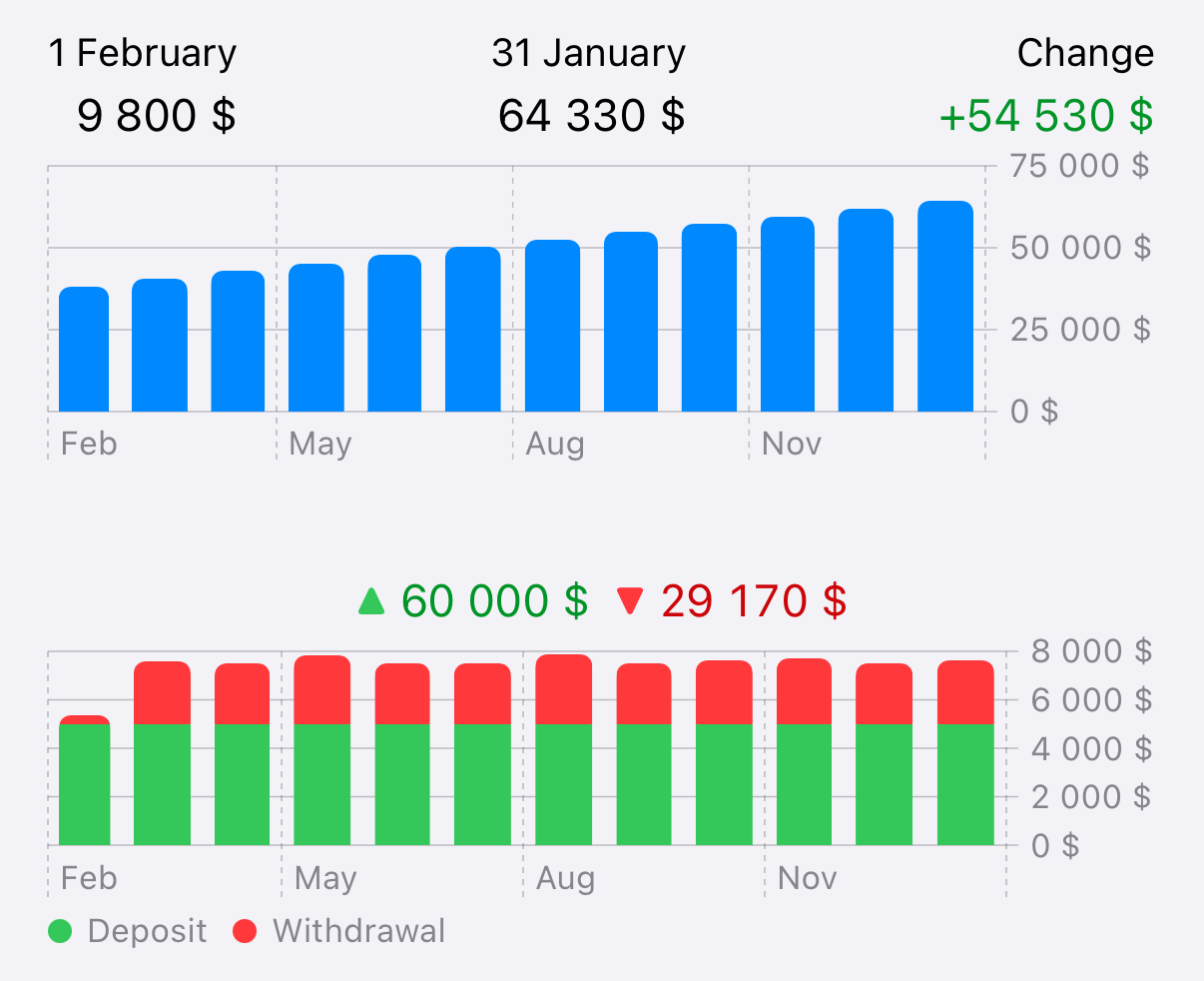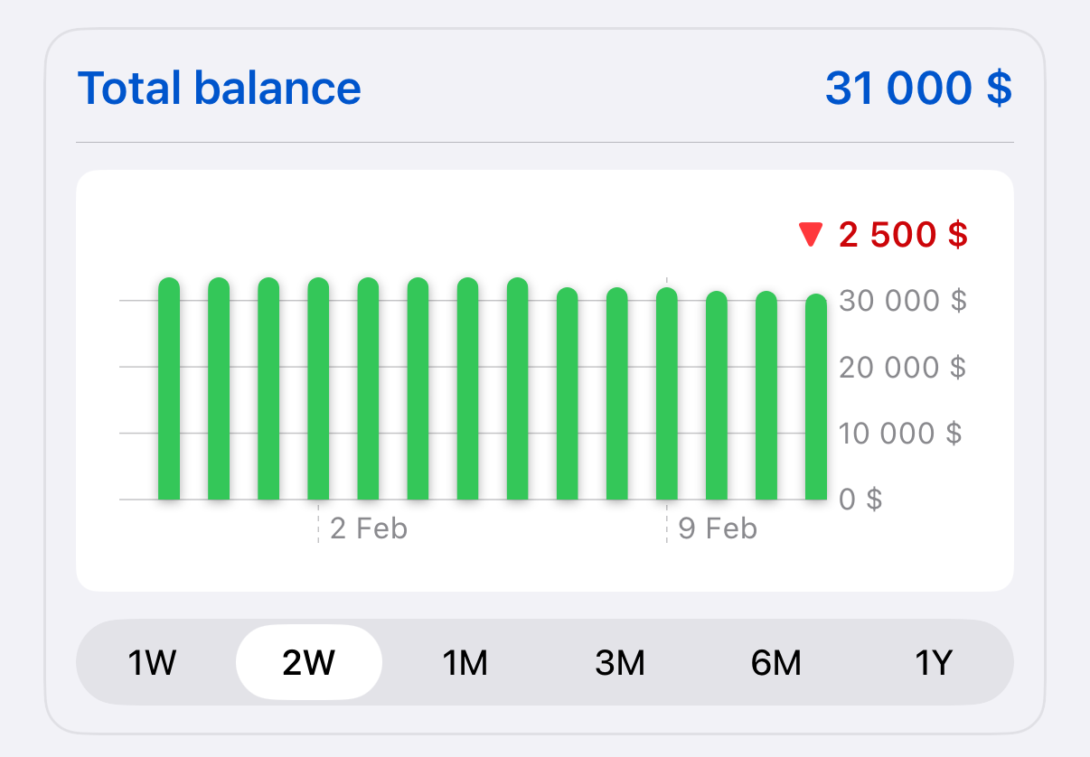 Balances from all accounts and wallets are automatically summed by currency, helping answer the question of how much money is available. Balance history helps improve financial planning.