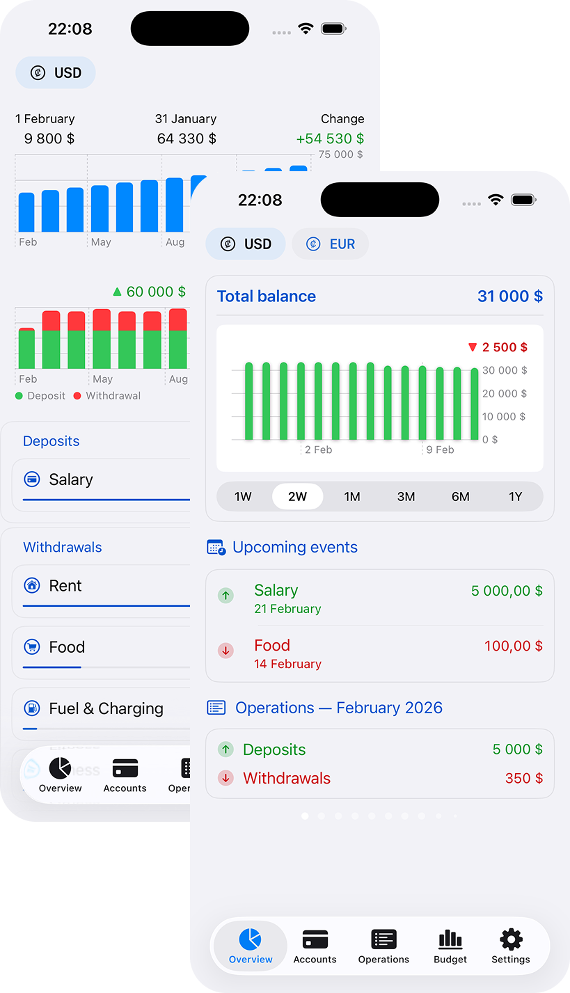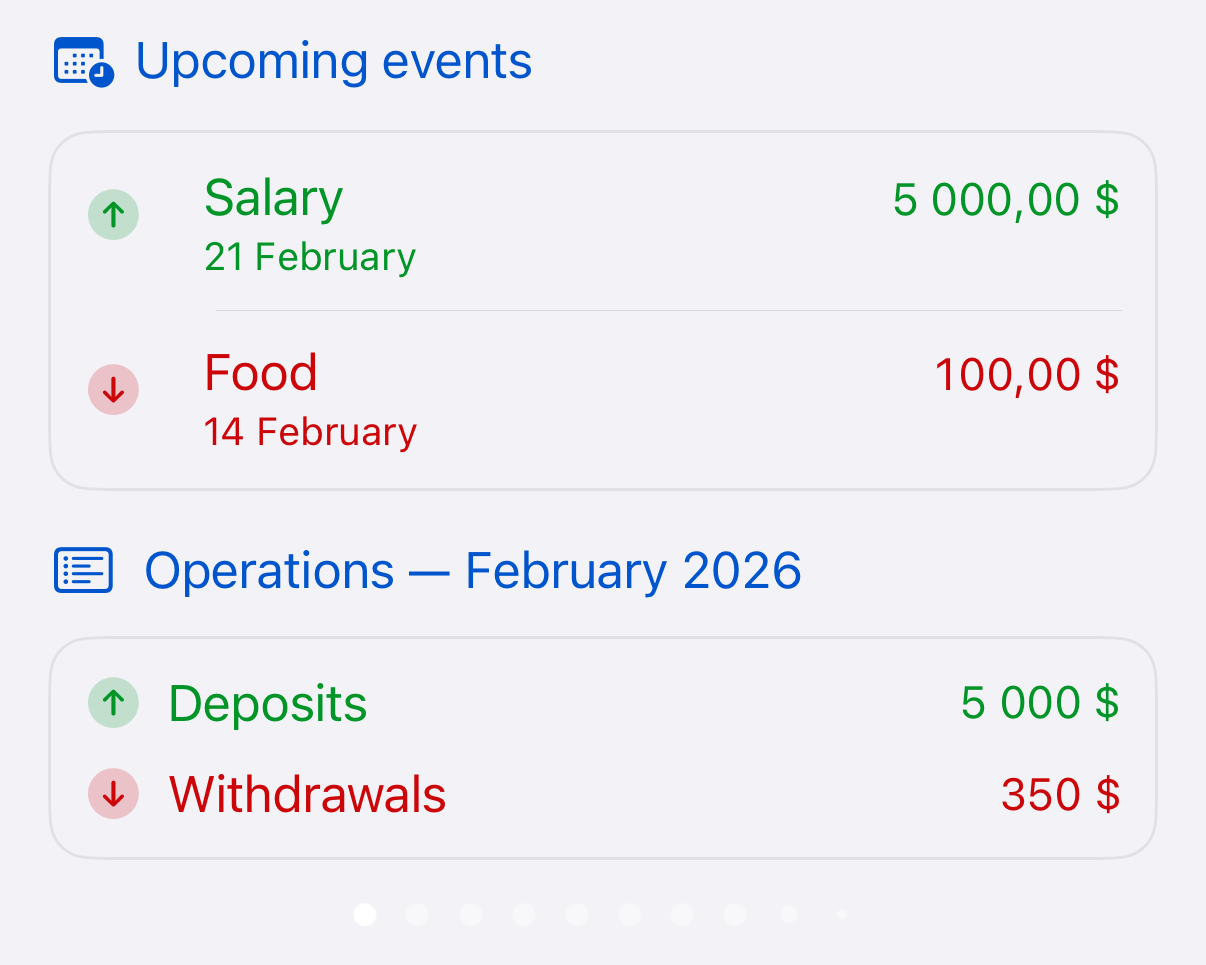 Balansly supports operations and accounts in any currency and popular cryptocurrencies. You can choose any currency for your accounts, cards, wallets, and operations. The app helps you track balance and budget for each currency you use.