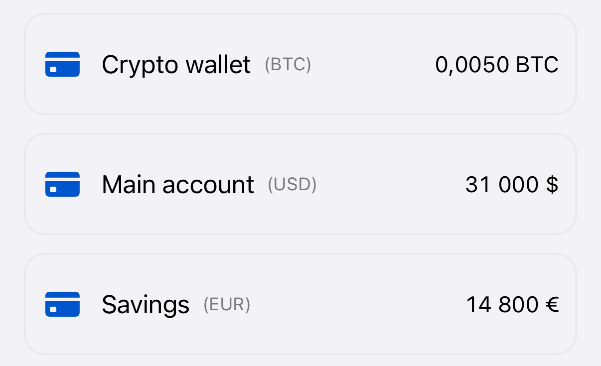 Все счета в одном месте. Контролируйте итоговый баланс по каждой валюте и криптовалютам с единым прозрачным интерфейсом.