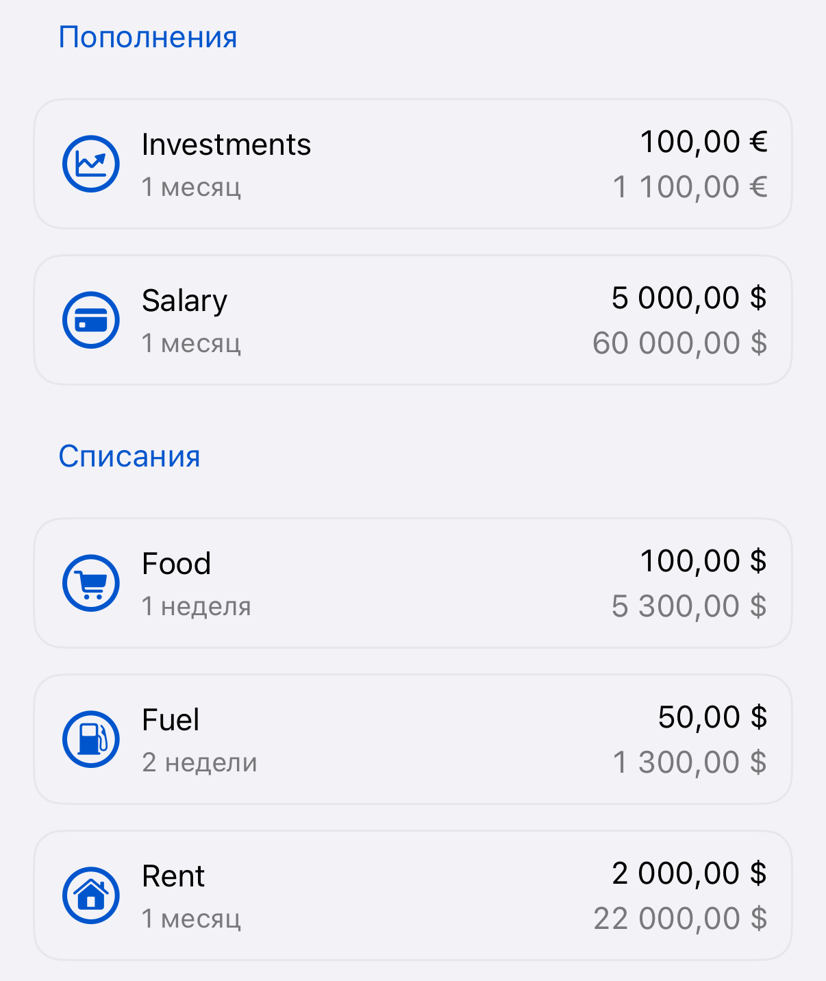 Вы можете зарегистрировать кошельки для всех своих счетов, банковских карт и даже наличных. Выбирайте нужную вам валюту или криптовалюту для каждого кошелька отдельно. Общий баланс автоматически суммируется по каждой валюте. Изменение баланса выполняется одним простым действием.